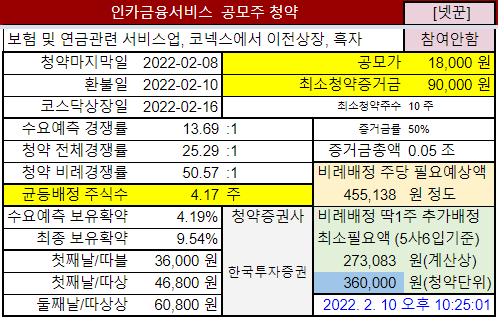 공모가/따상가격/수요예측/경쟁률 등은 아래 분석기록 부분에서 기본 표를 보시면 됩니다. ㆍ흑자 ㆍ상장공모: 신주모집 68.2% + 구주매출 31.8% ㆍ유통물량: 많음(43.40%) ㆍ청약증권사: 한국투자증권 단독 ㆍ온라인 청약수수료: 후불 2000원, 미배정 또는 상위등급 또는 IRP계좌보유시 면제