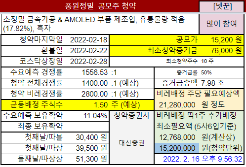 @2022-02-15 수요예측결과, 기관경쟁률 1,556.53:1, 보유확약 11.04%, 공모가 15,200원 (밴드상단)