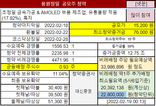 @2022-02-17 청약마감 균등배정 0.93주, 총경쟁률 2235.98:1
