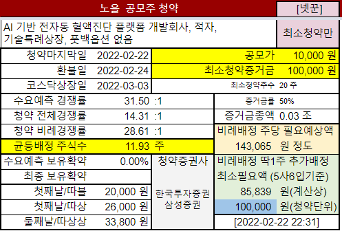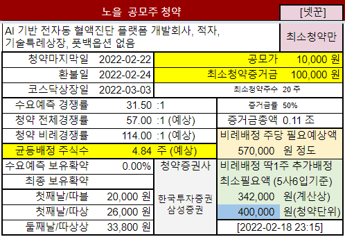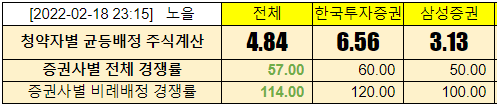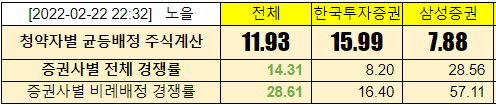 @2022-02-21 청약첫날, 전체경쟁률 4.01:1 (한국투자증권 2.21:1, 삼성증권 8.22:1)
