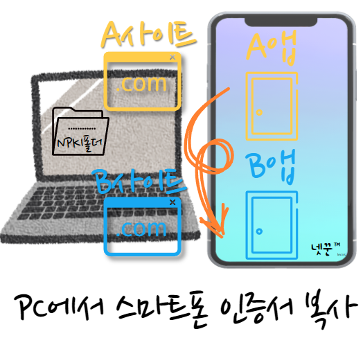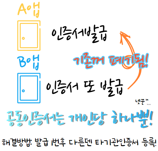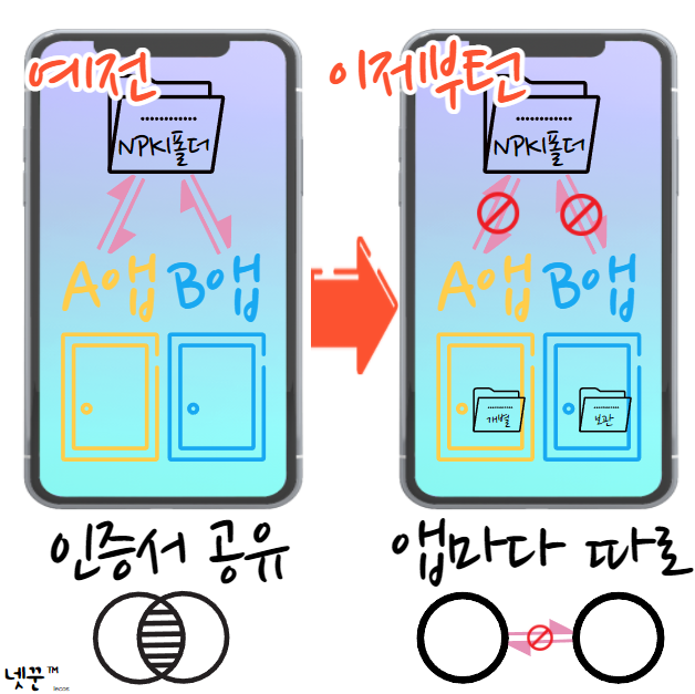 문제는 안드로이드(휴대폰 OS) 보안 정책이 변경되서 그렇습니다. 아이폰은 이미 이런 정책이었기때문에 알고계실 것 같고, 안드로이드는 최근 보안정책이 변경되어서 불편을 겪는 겁니다. 앱에서 공동인증서(구 공인인증서) 정보를 공유해서 사용하지 못하도록 바뀌었습니다.