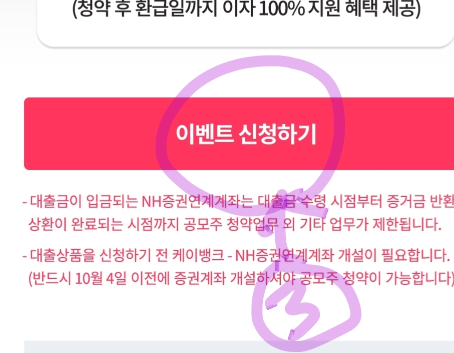 ● 청약대금 주식 오가는 것 설명 NH나무증권 연결계좌에 본인돈 500만원 넣어놓으면 이벤트 당첨 알림 받고나면 (이건 아직 어떤식으로 오는지 모르며 아마 문자메시지로 올 듯) 10월5일~6일 4500만원 대출받으면서 청약하게되고