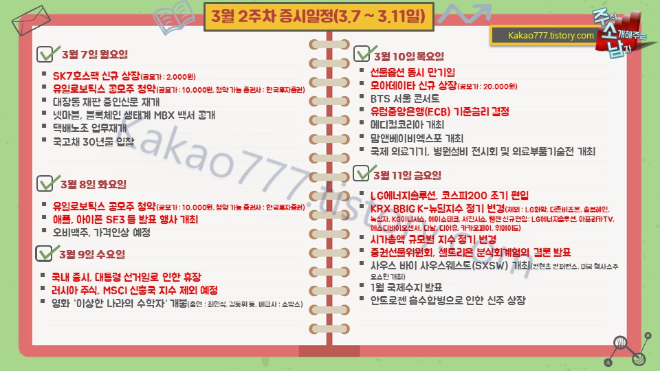 ● 공모주상장 #SK증권스팩7호 - SK증권 공모가 2천원https://lecos.tistory.com/299#SK7 ● 공모주청약 & 실권주청약 (~8일까지) #유일로보틱스 - 한국투자증권 공모가 만원, 최소청약증거금 10만원https://lecos.tistory.com/318 #일진디스플 - 미래에셋증권적자기업, 유상증자진행후 실권발생 확정발행가 1275원 금요일주가 1800원 (+41%차이) 실권주라 균등배정 없음 65만원당 1주예상 유일로보틱스보다 불리함 ● 공모주매도금 처리 #비씨엔씨 - NH투자증권 #노을 - 한국투자,삼성증권 ● 공모주 환불금 #코람코더원리츠 - 하나금투, 삼성