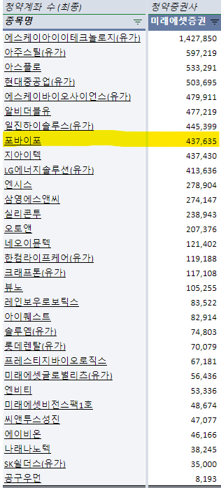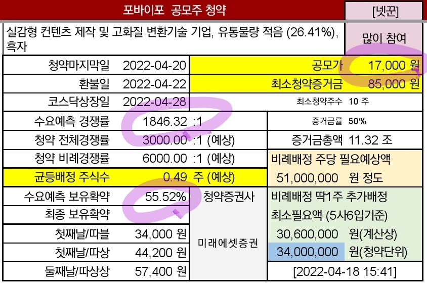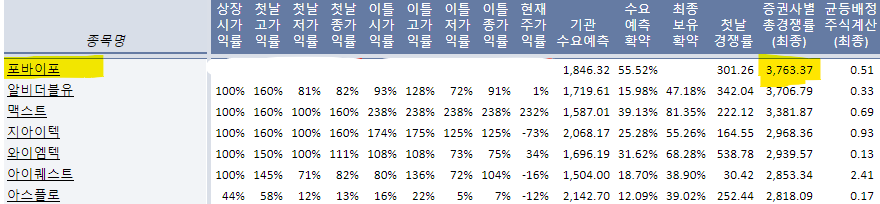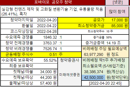 @2022-04-20 청약마감, 전체경쟁률 3763.37:1 (작년부터해서 1위네요 → 정정합니다 작년첫번째 공모주였던 #엔비티 공모주식수를 잘못 입력해서 순위에서 빠졌군요. #포바이포는 2위입니다.)