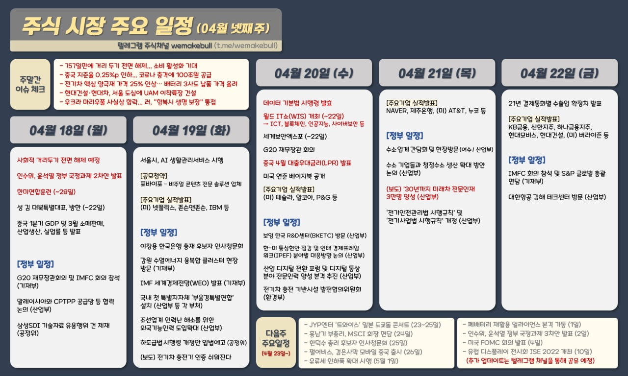 | 일정: 2022년 4월둘째주 공모주청약 등 일정 (0) | 2022.04.08 |