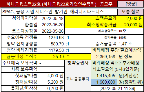 | 하나금융스팩22호 | 38 | 5.17~ 5.18수 |