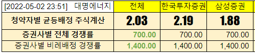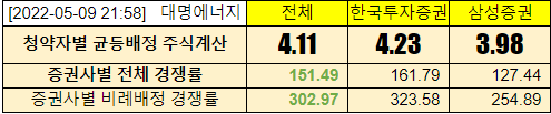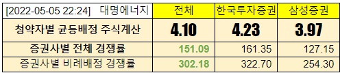 @2022-05-03 청약첫날, 전체경쟁률 한국투자증권 11.01:1, 삼성증권 12.54:1