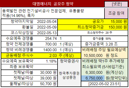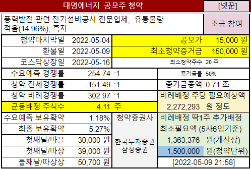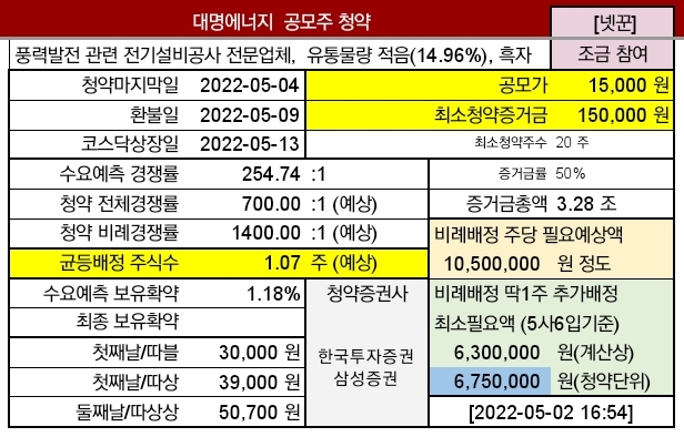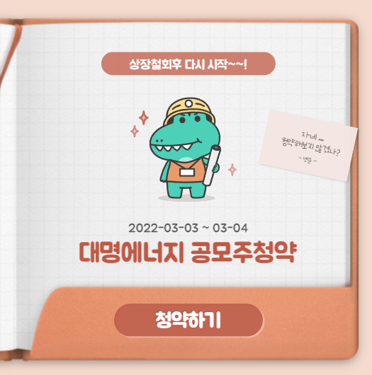 풍력발전 관련 전기설비공사 전문업체 대명에너지, 2월말에 상장철회했다가, 회사가치 즉 공모가를 많이 낮춰서 다시 진행하는 공모주청약입니다. 기업은 좋은데 너무 부풀렸던 점 때문에 기관 수요예측때 외면받았었습니다. 이번엔 잘 될까요?