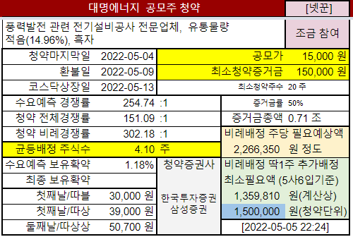 @2022-05-02 수요예측결과, 기관경쟁률 254:1, 보유확약 1.18%, 공모가 15000원 (밴드하단)