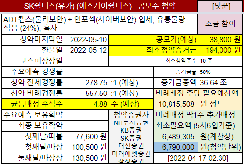 ADT캡스쪽만 비교하면 오프라인 보안업체 1위인 #에스원 보다 더 높게 평가하는 것은 문제가 있어보이지만, 급성장중인 온라인 보안분야쪽 인포섹을 같이보면 알 수 없는 상황인 공모주 청약입니다. 오프라인 보안업체들에 비해서는 높게 평가하고 온라인 보안업체들에 비해서는 낮게 평가했지만 전체 매출 비중에서는 오프라인이 반이 넘으니 잘 판단해야겠네요.