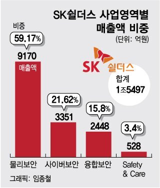 SK쉴더스의 사업 분야는 △물리보안(59%) △사이버 보안(21%) △융합보안(16%) △안전 및 케어(Safety&Care, 4%) 등 여러 영역에 걸쳐있다.