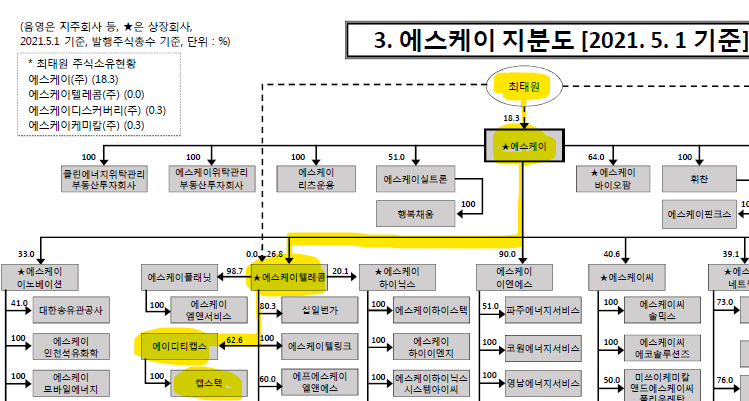작년5월기준으로는, 위 지배구조 그림처럼 SK그룹 동일인인 최태원 → #SK → #SK텔레콤 → #ADT캡스 지배구조였지만, #SK텔레콤이 #SK스퀘어 인적분할하고 ADT캡스가 SK인포섹과 합병되면서 최태원 → #SK → #SK스퀘어 → #SK쉴더스 형태가 됐습니다.