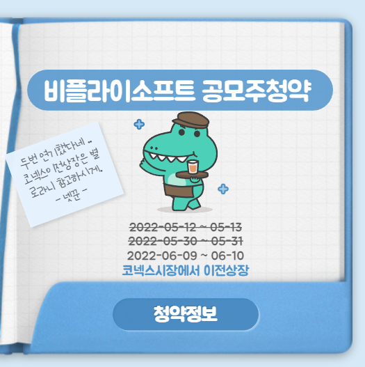 @2022-05-17 #비플라이소프트 6월로 일정연기함, 코넥스시장 주가가 현재 11,700원. 비상장주식 코넥스 주가도 폭락 수준이라 또 연기할 가능성이 농후함. 넷꾼참여도 낮춤: "최소"→"안함"