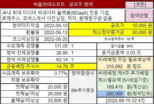 @2022-06-10 청약마감 전체경쟁률 26.8591:1, 균등배정 계산 14.79주, 실제 균등배정 17주씩 배정됨
