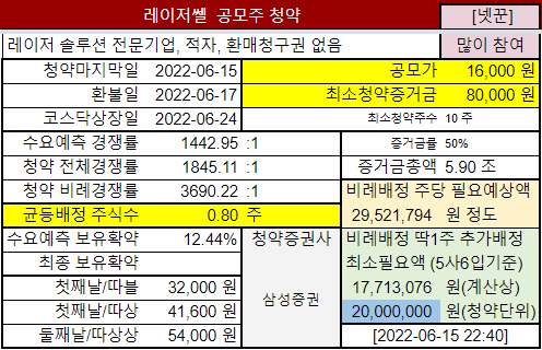 @2022-06-15 청약마감 전체경쟁률 1845.11:1 비례경쟁률 3690:1 배정결과가 오후 7시쯤 다 나왔습니다만, 비례배정 딱1주 배정단위가 2500주 2천만원이 아니네요. 전부 못받았습니다. 온라인등급 최대청약한도인 1만주 8000만원에 청약한 사람이 많아서 2500주 청약엔 배정이 안된 것으로 보입니다. (저는 3계좌나 2500주 넣었는데..ㅠㅠ)