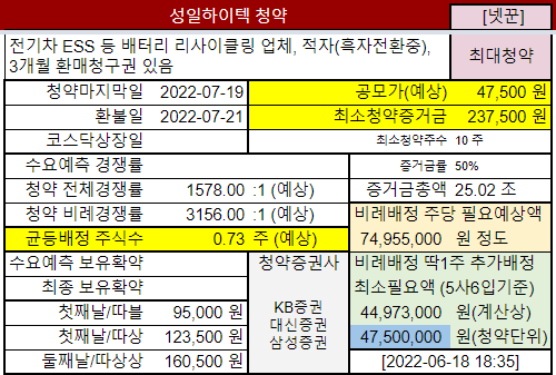 7월 묻지마청약 기대주라 미리 오픈했던 성일하이텍 공모주청약 정보입니다. 비상장주식을 알게된지 꽤 됐는데 시간이 참 빠르군요.