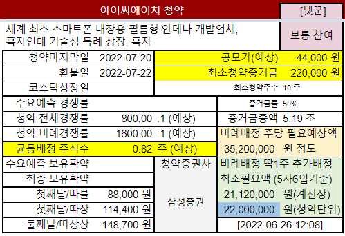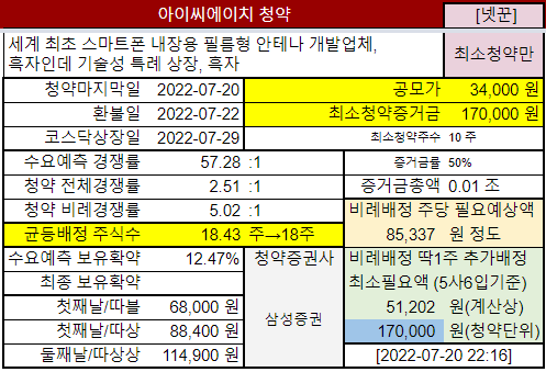 @2022-07-20 청약마감, 전체경쟁률 2.51:1 (너무 낮군요), 균등배정은 18.43주지만 19주정도 받을 듯 합니다.