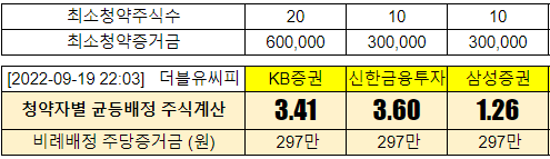 @2022-09-20 청약첫날 전체경쟁률 KB증권 2.39:1 신한금융투자 1.40:1, 삼성증권 2.53:1