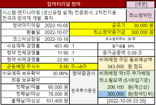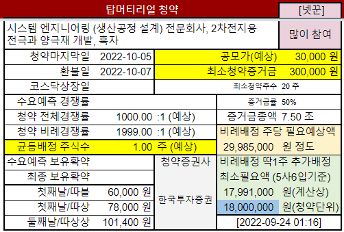 @2022-09-30 수요예측결과, 기관경쟁률 451.49:1 보유확약 30.96%, 공모가 3만원, 상장일 예정: 2022-10-07 기관경쟁률이 좀 낮은데 그 이유가 명확하지않네요. 특별히 기사도 못찾겠고, 단순히 평가할만한 상황은 아닌 듯 하여 일단 참여도 낮춥니다. "많이"→ "보통"
