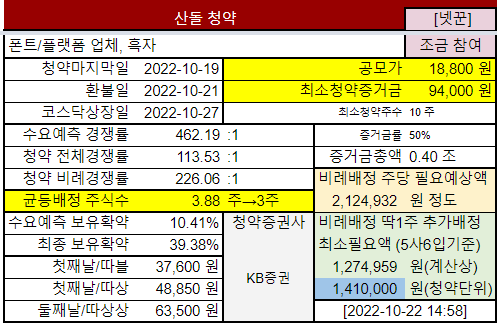 @2022-10-18 청약첫날, 전체경쟁률 3.38:1 @2022-10-19 청약마감, 전체경쟁률 113.53:1, 균등배정 3.88주