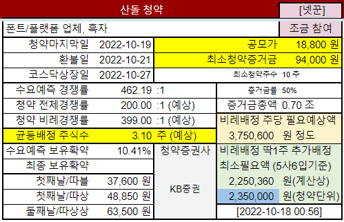 @2022-10-05 상장일 예정: 2022-10-27 @2022-10-17 수요예측결과, 기관경쟁률 462.19:1, 보유확약 10.41%, 공모가 18,800원 (=밴드상단)