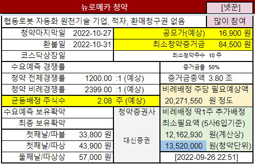 @2022-10-25 수요예측결과, 기관경쟁률 1,652.13:1, 보유확약 7.61%, 공모가 16,900원 (=밴드 상단), 상장예정일 2022-11-04, 전체적으로 예상 정도와 비슷해서 다른 업데이트 없이 그대로 유지하겠습니다. 서로 상반된 장점/단점이 혼재되어있긴 한데 긍정적이라고 생각됩니다.