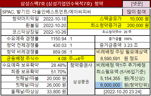 @2022-10-14 수요예측결과, 기관경쟁률 1,150.94:1 (공모가 만원으로 올린뒤 첫 스팩인 하나금융스팩25호에 비하면 많이 높은 수치), 보유확약 28.48%, 상장예정일 2022-10-26