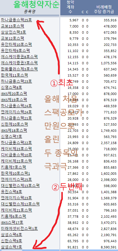 올해 스팩 청약을 봤는데 청약자순으로 나열했을때 공모가를 만원으로 올린 두종목이 극과 극이었네요.