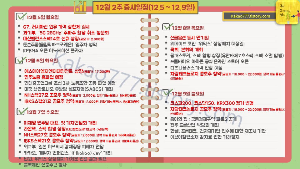 ● 코스피200, 코스닥150 정기변경 ● 저녁10시반 미국 11월생산자물가지수(PPI) 발표 MoM 예상 0.2% YoY 예상 7.2% ● 넷플릭스 종이의 집: 공동경제구역 파트 2 공개 ● KB증권 장외채권 만원쿠폰 이벤트 https://lecos.tistory.com/523