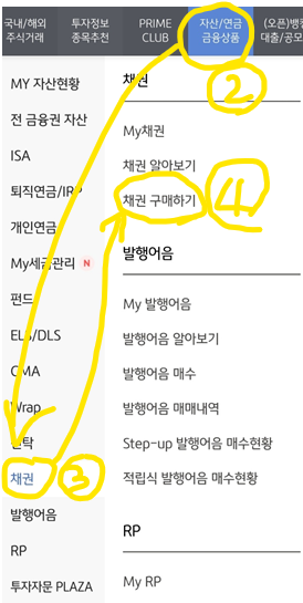 M-able 앱에서 ① 메뉴 → ② 위쪽 "자산/연금 금융상품" 탭 → ③ 왼쪽아래 "채권" → ④ 오른쪽 "채권구매하기"