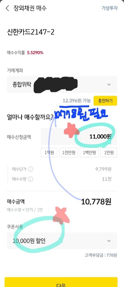 → ⑥ 채권을 1만1천원어치를 매수하세요. 만원 딱 넘어가게 맞추시면 되는데 신한카드2147-2 채권은 9792원정도라 11주 11000원을 선택하시면 됩니다. 그리고 쿠폰을 적용하세요.