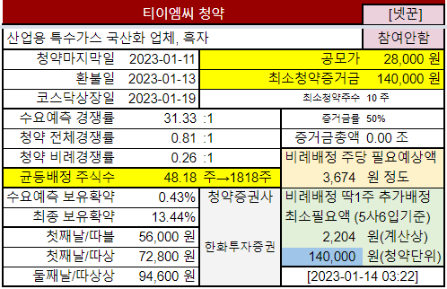 @2023-01-11 청약마감, 전체경쟁률 0.81:1, 균등배정 계산상 105.49주인데 경쟁률이 1:1이 안되서 개인주주 배정물량을 전량 배정하게 되서 약 200주넘게 배정될 듯 합니다.
