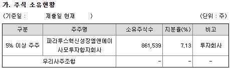 소액주주: 메리츠증권 등 모두 5.68% 정도 됩니다. 물적분할했는데 재무구조가 안좋아 FI(재무적투자자)를 많이 끌여들인 결과 주주가 복잡하군요.