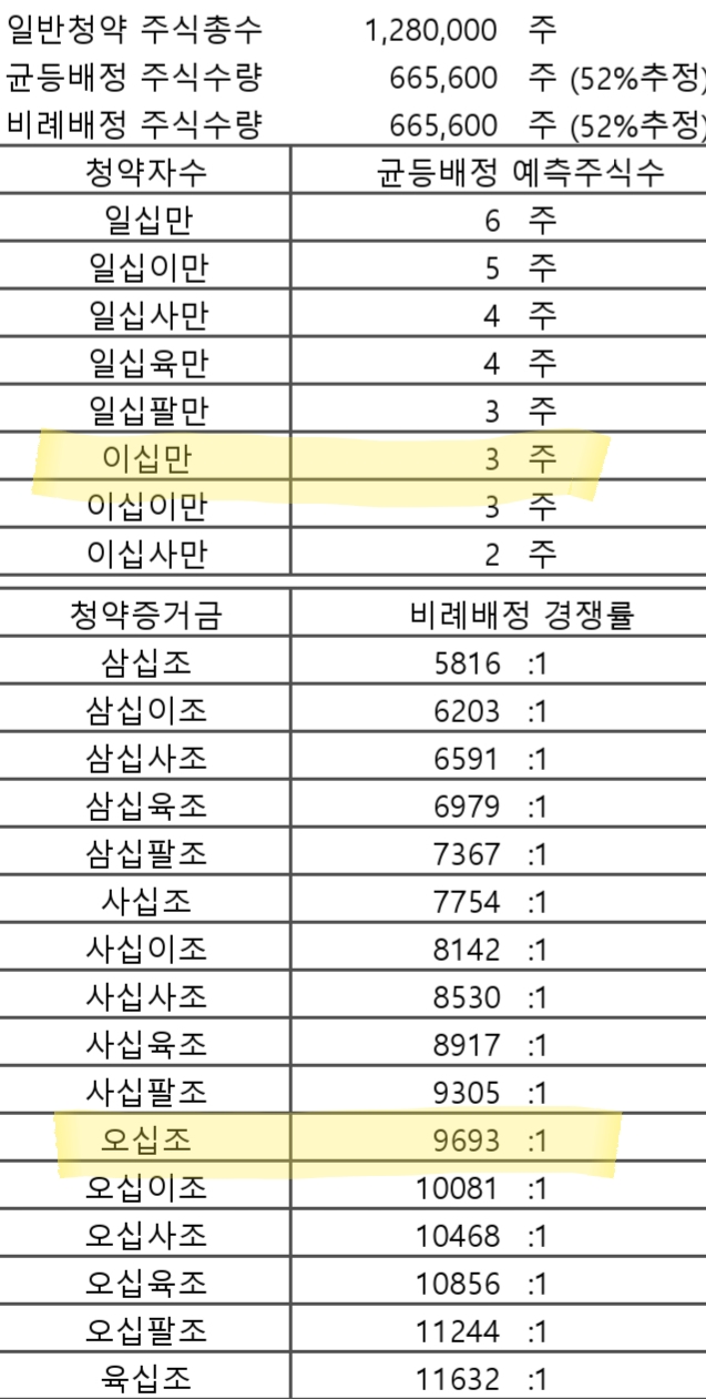 삼성증권의 경우를 보면 배정주식수보다 청약자수가 많아질 경우도 있겠다 싶네요. 이럴경우 균등배정을 1주씩 다 나눠주지 못하니 추첨으로 나눠줄 것 같고 비례배정은 전혀없게되는 경우도 생길것 같습니다.