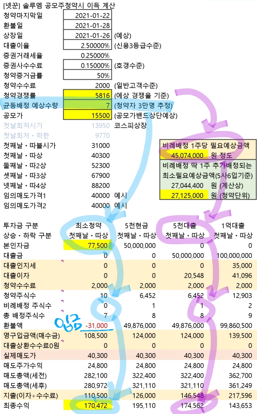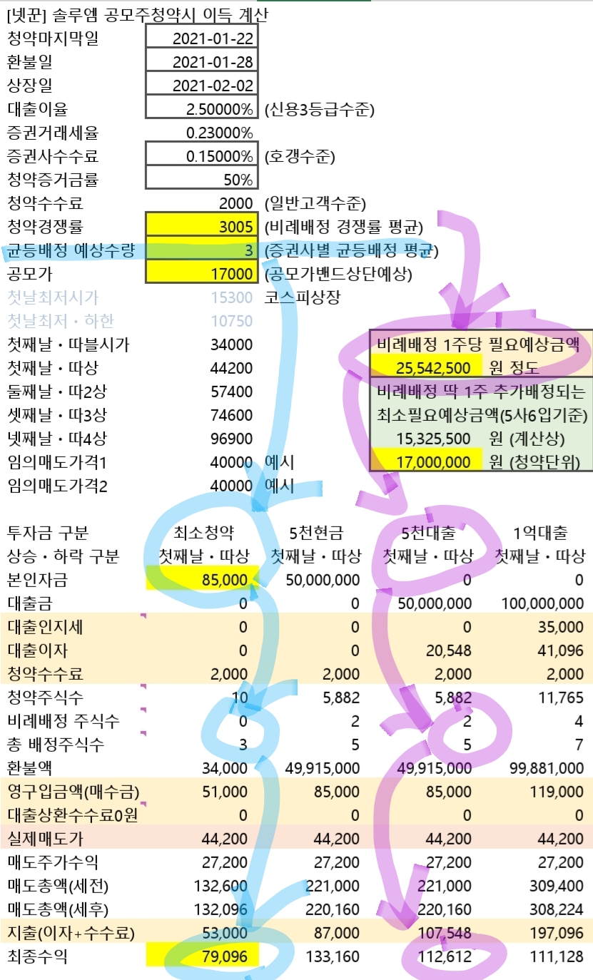 하늘색선 흐름을 보면 7만7천원 넣고 청약해서 균등배정 3주받아 따상때 팔면 7만1941원 버네요.