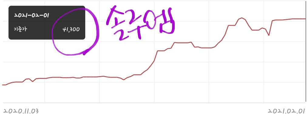 둘째날 종가 28,450 등 4일간 하락세후 박스권이어지다 신규상장주 폭등세에 힘입어 2021-02-09~10 상승반전함.