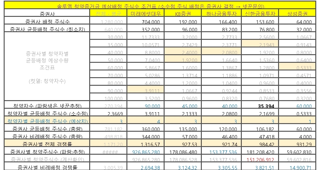 증권사별 최종 청약경쟁률 조사내용과 균등배정 주식수 예상치 등을 위 표에 넣어놨습니다.