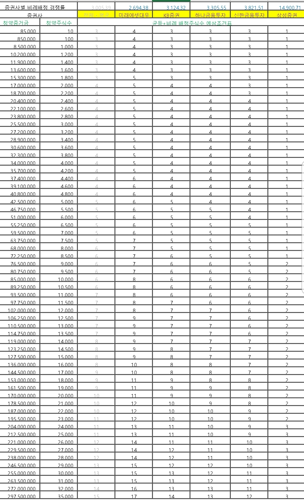 (6-1) 증권사별 청약경쟁률과 균등배정수 예측과 비례배정 경쟁률 예측표