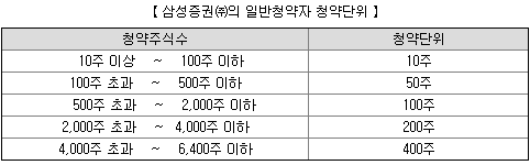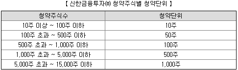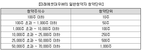 증권사별 청약단위는 다음과 같습니다. 왠만하면 청약 첫날 증권사 앱으로 접속해서 미리 청약증거금 조견표를 확인하시는 걸 추천드립니다.
