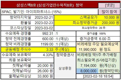@2023-02-18 (어제)수요예측결과, 기관경쟁률 992.31:1, 보유확약 4.33%, 상장예정일 2023-03-02