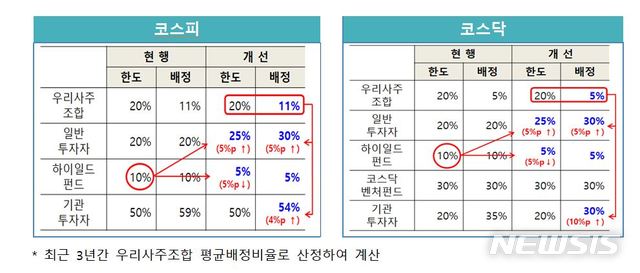우리사주 청약의 실권물량을 기관쪽으로 주던 걸 일반청약자쪽으로 변경하게되고 하이일드 펀드 물량도 줄여서 일반청약자에게 유리하도록 변경합니다. 30%가 확정이 아니고 최소 25% ~ 최대 30% 사이에서 결정됩니다.