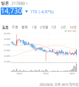 - 틸론 코넥스시장 현재주가: 14730원 (엄청하락했습니다), 괴리가 너무 크네요.