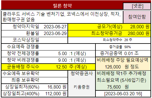 클라우드 서비스 기술 벤처기업 틸론 공모주청약 정보입니다.