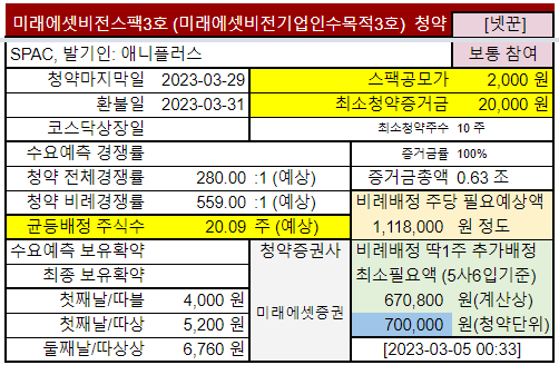 @2023-03-07 청약마감 전체경쟁률 0.46:1, 비례경쟁률 균등배정 308.64주 (경쟁률 1:1이 안되서 1500주정도로 늘어날 것으로 보입니다.)