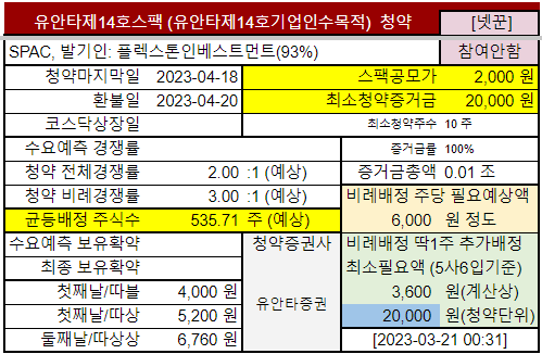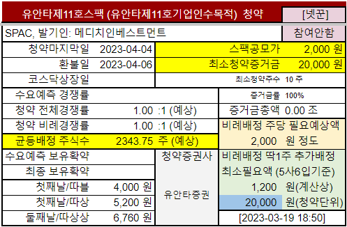 @2023-03-19 #유안타제11호스팩, 유안타스팩 번호가 13→12→11순으로 됐네요. 12호는 상장일에 매수를 못했는데 일단 11호도 상장일 매수해보려고 합니다.