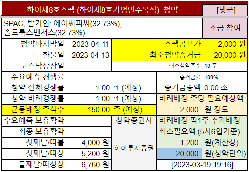 | P | 하이투자증권 | SPAC, 발기인: 에이씨피씨(32.73%), 솔트룩스벤처스(32.73%) | ||||