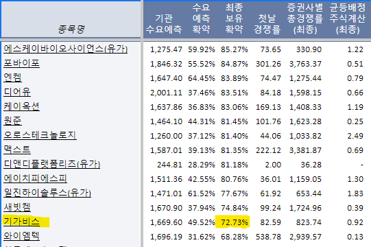 기관보유확약 49.52% → 72.73% (하락할 줄 알았는데 확약위주로 배정을 했나보네요)