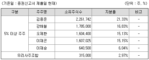 최대주주 김종준, 강해철 대표이사와 사내이사들의 지분이 높으며, 소액주주 33명 11.32% 지분입니다.