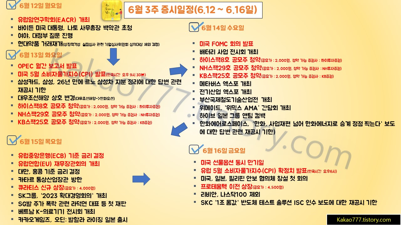 ● 스팩 공모주청약 (~4시까지) #하이제8호스팩 - 하이투자증권 #엔에이치스팩29호 - NH투자증권 #케이비제25호스팩 - KB증권 공모가 2천, 수수료 2천, 최소청약증거금 2만원https://lecos.tistory.com/640#HI8 https://lecos.tistory.com/640#NH29 https://lecos.tistory.com/640#KB25 ● 2023 메타버스 엑스포 (~16일까지) - 서울 코엑스 ● 2023 대한민국 전기산업 엑스포 (~16일까지) - 대구 엑스코 ● 부산국제철도기술산업전 개최 (~17일까지) - 부산 해운대구 벡스코 제1전시장● 14일저녁9시반, 미국 생산자물가지수(PPI) 발표● 15일새벽3시, 미국 금리발표