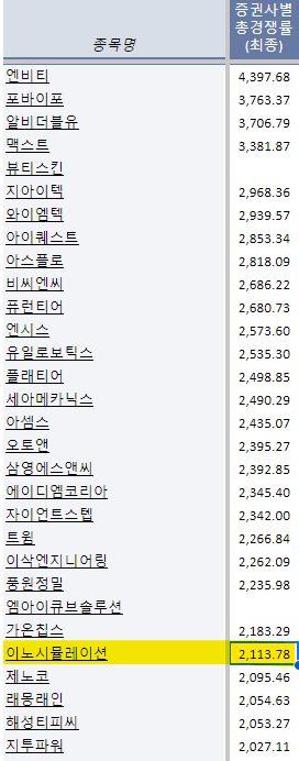 전체경쟁률 기준 2021년이후 290여종목중 24위고 올해 1위네요 (다음달 종목인 #뷰티스킨 #엠아이큐브솔루션 두개 제외)